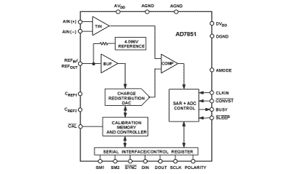 The AD7851 is a high speed, 14-bit ADC which operate from a single 5V power supply. The ADC powers-up with a set of default conditions at which time it can be operated as a read-only ADC. The ADC contains self-calibration and system calibration options to ensure accurate operation over time and temperature and has a number of power down options for low power applications.The AD7851 is capable of 272kHz throughput rate. The input track-and-hold acquires a signal in 0.33 us and features a pseudo-differential sampling scheme. The AD7851 has the added advantage of two input voltage ranges ( 0 to VREF, and -VREF/2 to +VREF/2 centered about VREF/2). Input signal range is to VDD and the part is capable of converting full-power signals to 140 kHz.CMOS construction ensures low power dissipation (60 mW typ) with power-down mode (5 uW typ). The part is available in 24- pin, 0.3 inch-wide dual-in-line package (DIP), 24 lead small outline (SOIC) and 24 lead small shrink outline (SSOP) packages.