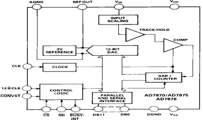 The AD7870/AD7875/AD7876 is a fast, complete, 12-bit A/D converter. It consists of a track/hold amplifier, 8 us successive approximation ADC, 3 V buried Zener reference and versatile interface logic. The ADC features a self-contained internal clock which is laser trimmed to guarantee accurate control of conversion time. No external clock timing components are required; the on-chip clock may he overridden by an external clock if required.