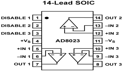 AD8023的带宽为250 MHz,压摆率为1200 V/us,适合要求+5 V单电源或最高±7.5 V双电源的高速应用。此外,AD8023的每个放大器均内置高速禁用功能,可进入省电模式或提供高阻抗输出。因此,这款器件可以用于视频多路复用应用。AD8023可用于-40°C至+85°C工业温度范围