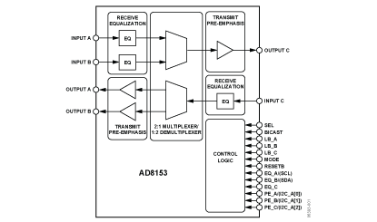 AD8153: Single-Lane 3.2G 2:1 Mux / 1:2 Demux Switch with Input Equalization and Output Pre-Emphasis