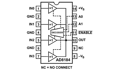 The AD8184 offers a high speed disable feature allowing the output to be put into a high impedance state. This allows multiple outputs to be connected together for cascading stages while the "OFF" channels do not load the output bus. It operates on voltage supplies of ±5 V and is offered in 14-lead PDIP and SOIC packages.