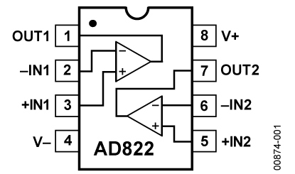 The AD822 is a dual precision, low power FET input op amp that can operate from a single supply of 3 V to 36 V or dual supplies of ±1.5 V to ±18 V. It has true single-supply capability with an input voltage range extending below the negative rail, allowing the AD822 to accommodate input signals below ground in the single-supply mode. Output voltage swing extends to within 10 mV of each rail, providing the maximum output dynamic range.