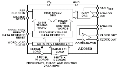 The frequency tuning, control, and phase modulation words are loaded into the AD9850 via a parallel byte or serial loading format. The parallel load format consists of five iterative loads of an 8-bit control word (byte). The first byte controls phase modulation, power-down enable, and loading format; bytes 2–5 comprise the 32-bit frequency tuning word. Serial loading is accomplished via a 40-bit serial data stream on a single pin. The AD9850 Complete-DDS uses advanced CMOS technology to provide this breakthrough level of functionality and performance on just 155 mW of power dissipation (+3.3 V supply).