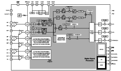 The ADE7854 is a high accuracy, 3-phase electrical energy measurement IC with serial interfaces and three flexible pulse outputs. The ADE7854 incorporates second-order Σ-Δ ADCs, a digital integrator, reference circuitry, and all the signal processing required to perform total active and apparent energy measurement and rms calculations. A fixed function digital signal processor (DSP) executes this signal processing.The ADE7854 is suitable to measure active and apparent energy in various 3-phase configurations, such as WYE or DELTA services, with both three and four wires. The ADE7854 provides system calibration features for each phase, that is, rms offset correction, phase calibration, and gain calibration. The CF1, CF2 and CF3 logic outputs provide a wide choice of power information: total active power, total apparent power or sum of current rms values.The ADE7854 has waveform sample registers that allow access to all ADC outputs. The device also incorporates power quality measurements such as short duration low or high voltage detections, short duration high current variations, line voltage period measurement and angles between phase voltages and currents. Two serial interfaces can be used to communicate with the ADE7854 : SPI or I²C while a dedicated high speed interface, HSDC (High Speed Data Capture) port, can be used in conjunction with I²C to provide access to the ADC outputs and real time power information. The ADE7854 has also two interrupt request pins, IRQ0 and IRQ1, to indicate that an enabled interrupt event has occurred.The ADE7854 is available in 40-lead LFCSP lead free package.