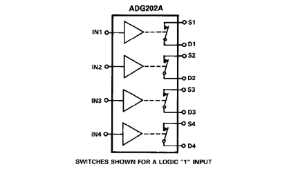 The ADG202A switches are turned on with a logic high on the appropriate control input. Each switch conducts equally well in both directions when ON and each has an input signal range that extends to the supplies. All switches exhibit break-before-make switching action for use in multiplexer applications. Inherent in the design is low charge injection for minimum transients when switching the digital inputs.