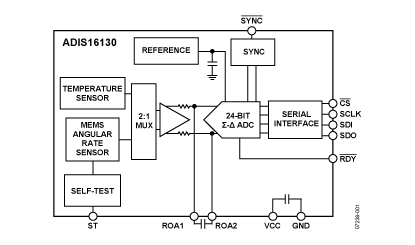 The ADIS16130 is a low noise, digital output angular rate sensor (gyroscope) that provides an output response over the complete dynamic range of ±250o/sec.