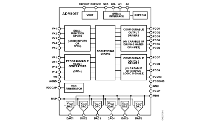 The ADM1067 Super Sequencer(R) is a configurable supervisory/ sequencing device that offers a single-chip solution for supply monitoring and sequencing in multiple supply systems. In addition to these functions, the ADM1067 integrates six 8-bit voltage output DACs. These circuits can be used to implement an open-loop margining system that enables supply adjustment by altering either the feedback node or reference of a dc-to-dc converter using the DAC outputs.