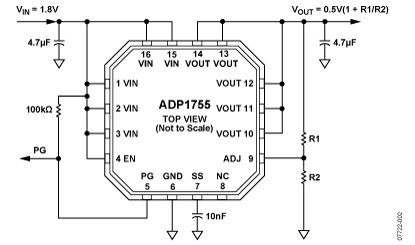 ADP1754/ADP1755采用16引脚4 mm × 4 mm LFCSP封装,这使其不仅成为外形尺寸极小的解决方案,而且还能以小巧的外形尺寸为需要高达1.2A输出电流的应用提供出色的散热性能。