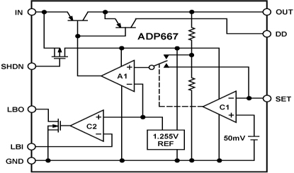 The ADP667 is a low-dropout precision voltage regulator that can supply up to 250 mA output current. It can be used to give a fixed +5 V output with no additional external components or can be adjusted from +1.3 V to +16 V using two external resistors. Fixed or adjustable operation is automatically selected via the SET input. The low quiescent current (20 uA) in conjunction with the standby or shutdown mode (0.2 uA) makes this device especially suitable for battery powered systems. The dropout voltage when supplying 100 uA is only 5 mV allowing operation with minimal headroom and prolonging the battery useful life. At higher output current levels the dropout remains low increasing to just 150 mV when supplying 200 mA. A wide input voltage range from 3.5 V to 16.5 V is allowable.