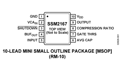 The SSM2167 is a complete and flexible solution for conditioning microphone inputs in personal electronics and computer audio systems. It is also excellent for improving vocal clarity in com-munications and public address systems. A low noise voltage controlled amplifier (VCA) provides a gain that is dynamically adjusted by a control loop to maintain a set compression characteristic. The compression ratio is set by a single resistor and can be varied from 1:1 to over 10:1 relative to the fixed rotation point. Signals above the rotation point are limited to prevent overload and to eliminate popping. A downward expander (noise gate) prevents amplification of background noise or hum. This results in optimized signal levels prior to digitization, thereby eliminating the need for additional gain or attenuation in the digital domain. The flexibility of setting the compression ratio and the time constant of the level detector, coupled with two values of rotation point, make the SSM2167 easy to integrate in a wide variety of microphone conditioning applications.
